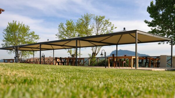 - tende laterali in PVC con cerniera di chiusura e strisce in Velcro per il fissaggio alle colonne, con finestrature personalizzate in PVC Cristal